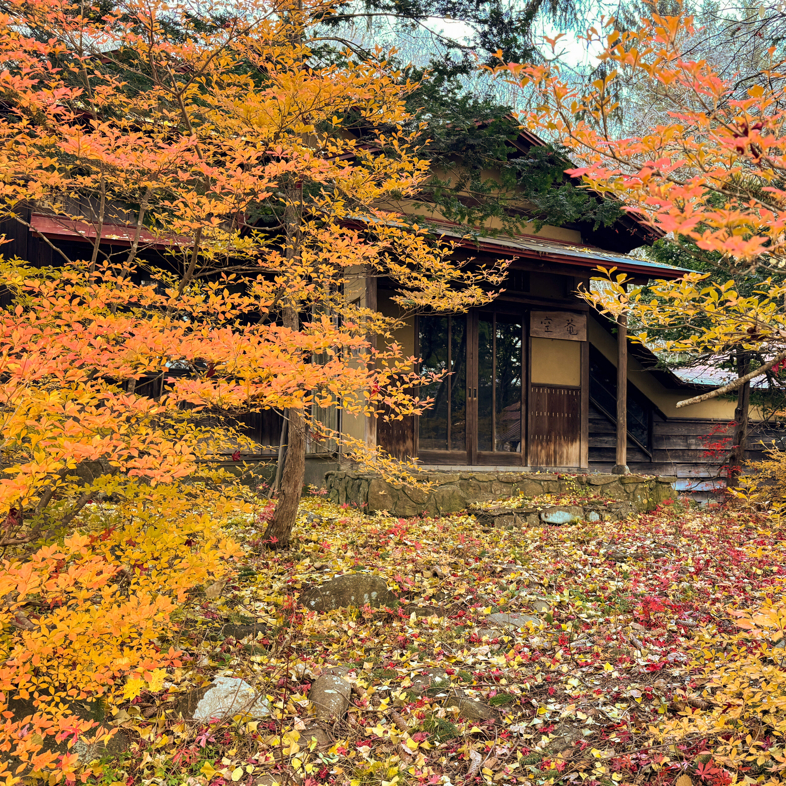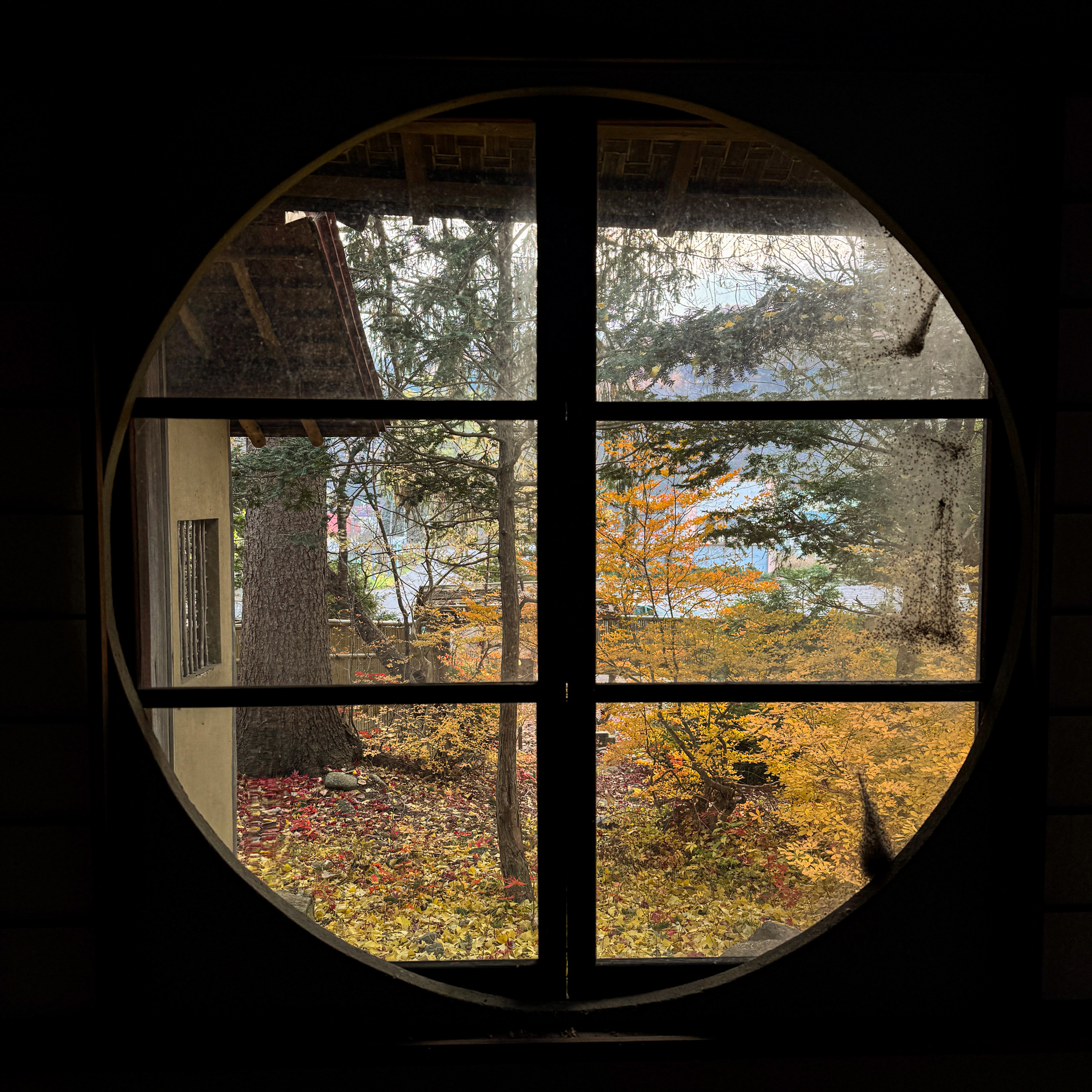 別館には「空庵」と名付けられた茶室がある。私が訪れた11月初旬、空庵の円窓の向こうには、庭園の見事な紅葉が広がっていた。茶室の円窓は禅における「円相」に由来し、真理や宇宙を象徴するとされる。また「己の心を映す窓」という意味も持つという。かつて萩原吉太郎たちの眼には、この円窓を通してどんな景色が映っていたのだろうか。静寂に包まれた空庵には、そんな想像を掻き立てる独特の空気が漂っていた。